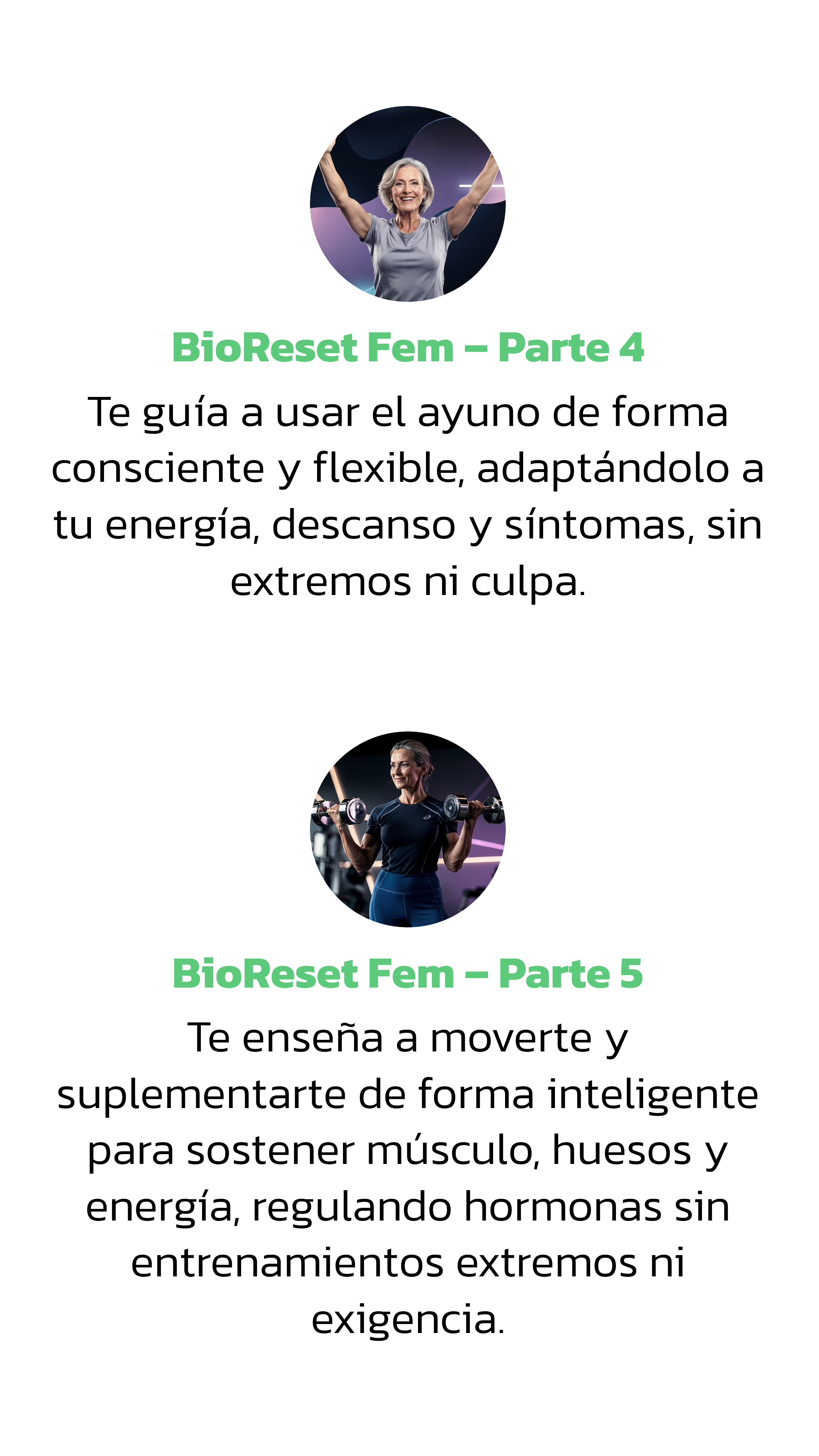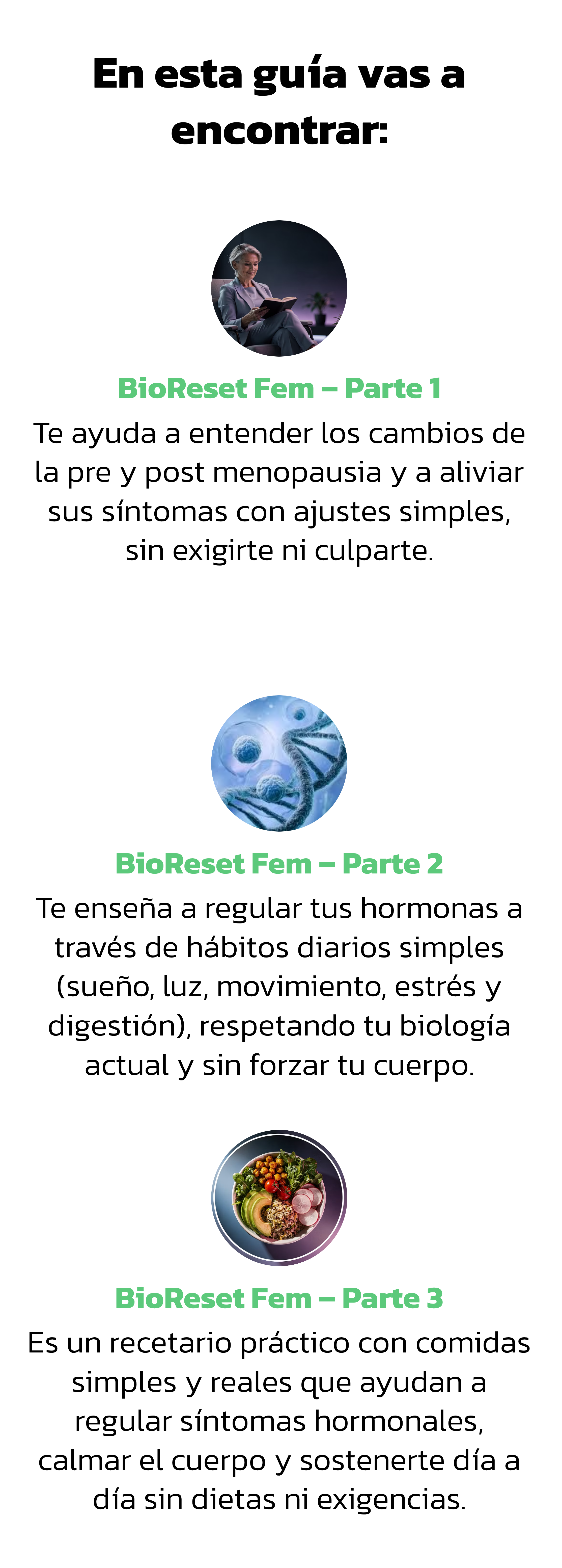 BioReset Fem es un programa digital completo que incluye el ebook Parte 1 y Parte 2, junto con guías prácticas y bonos. No es solo información para leer, sino un material pensado para aplicarse en el día a día.